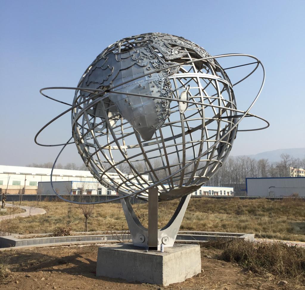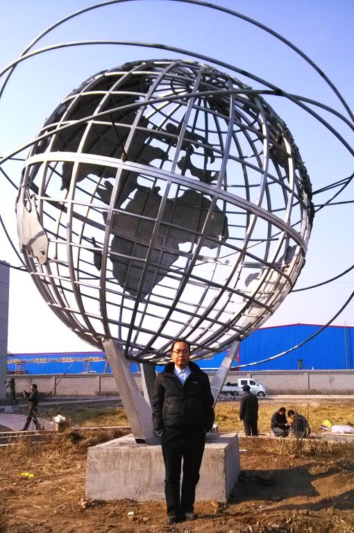 这五件雕塑中,以地球仪雕塑的制作难度最大,主要难度体现为:球体的精确计算加工和焊接变型。通过精密的计算、精心的施工以及高超的焊接技术,地球仪雕塑的制作终于顺利圆满完工,赢得甲方好评,同时也再次创下了杨刚老师雕塑艺术创作的新高度。